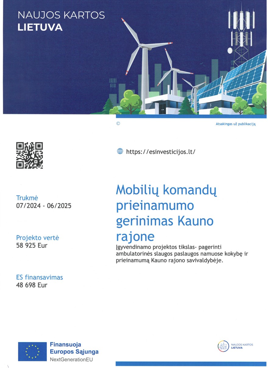 Projekto tikslas - pagerinti ambulatorinės slaugos paslaugas namuose kokybę ir prieinamumą Kauno rajono savivaldybėje.