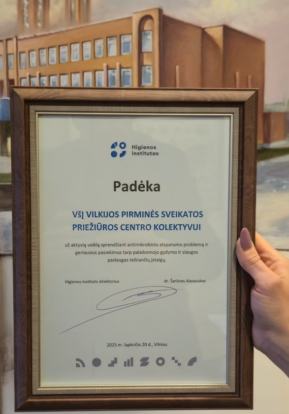 Džiaugsmingai priimta žinia ir padėka: VšĮ Vilkijos pirminės sveikatos priežiūros centro kolektyvas įvertintas už aktyvią veiklą sprendžiant antimikrobinio atsparumo problemą ir geriausius pasiekimus tarp palaikomojo gydymo ir slaugos paslaugas teikiančių įstaigų.